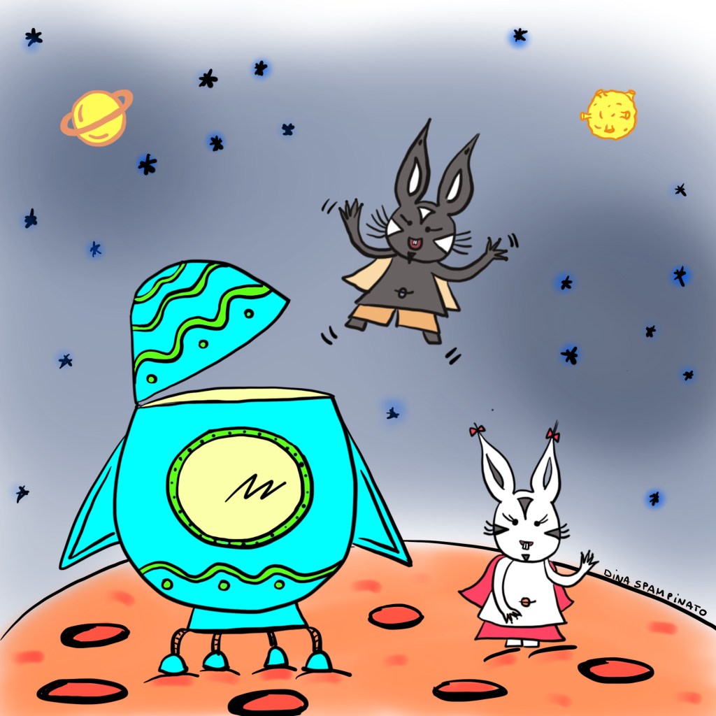 Estos conejos galácticos, no reparten huevos de chocolate, pero vuelan en uno! En el espacio también se festeja! 😉