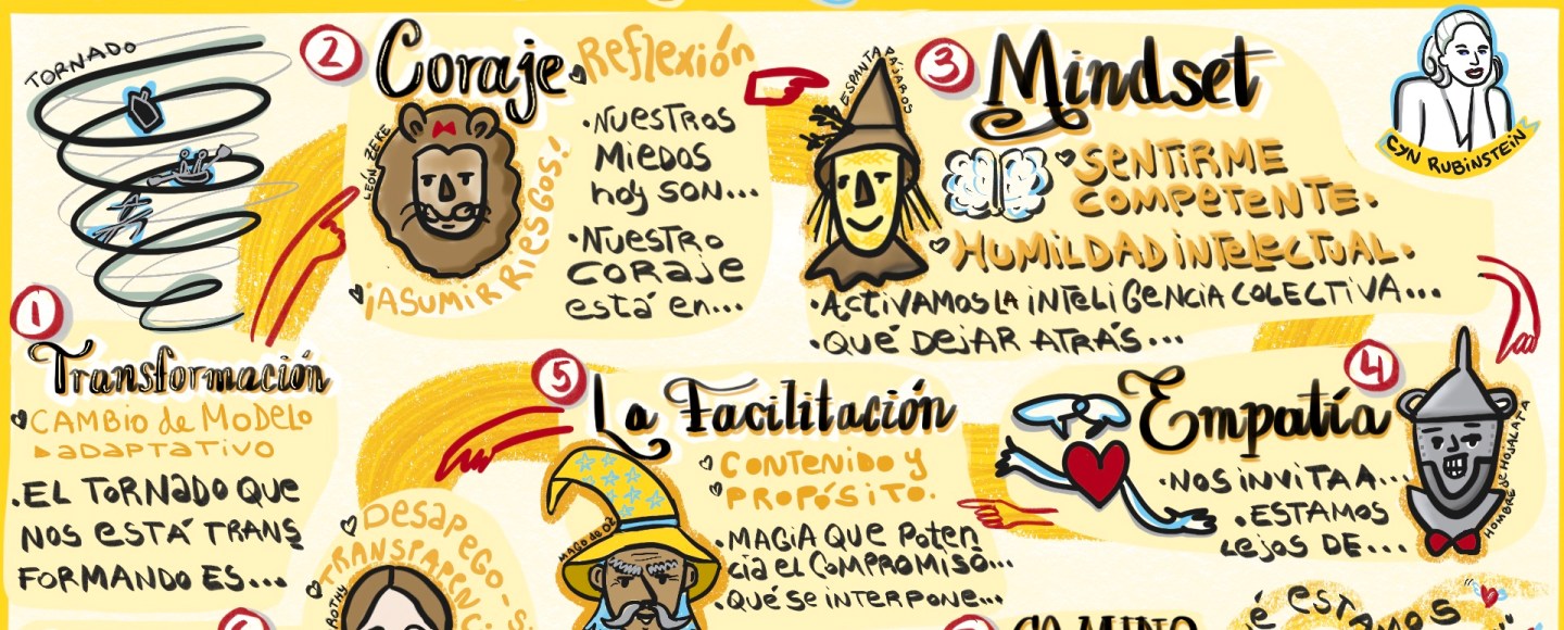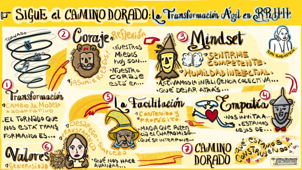En el Mago de Oz, Dorothy sigue por el camino dorado, pero no va sola, sino que lo hace con sus amigos. Esta Facilitación Gráfica fue muy especial, porque fuimos de la mano con Cyn Rubinstein, transitando este camino y el resultado se nota en el trabajo final! 🙂