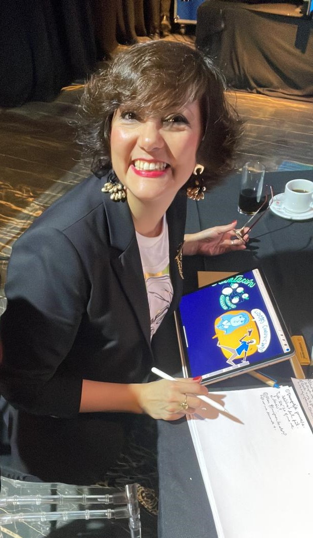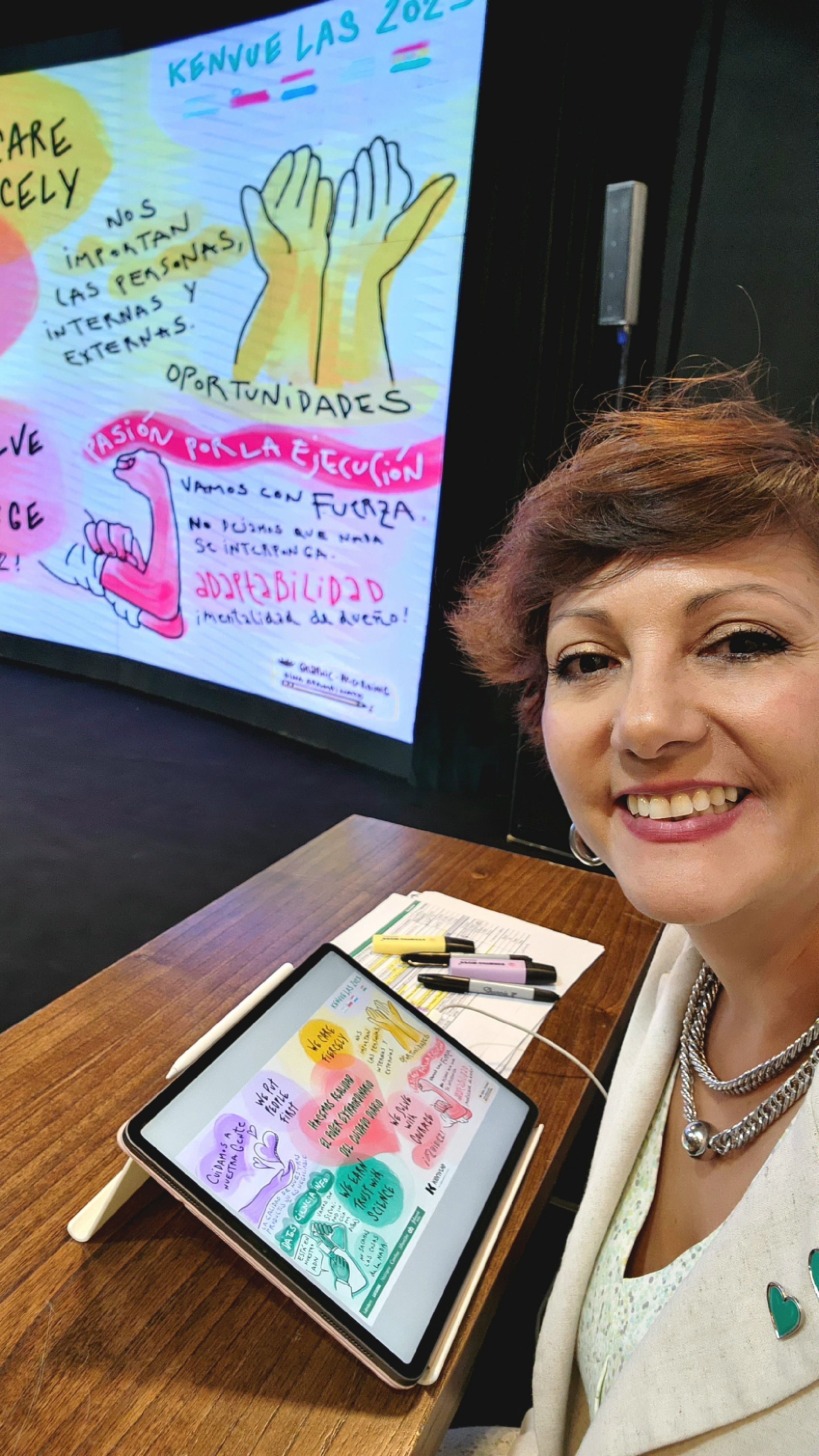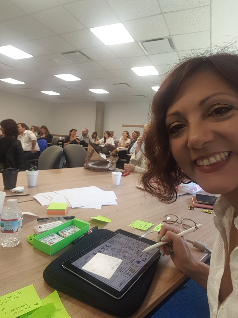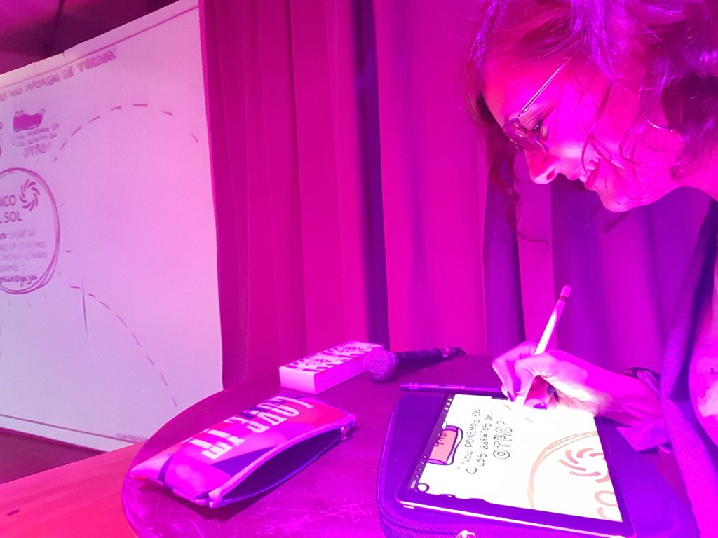 TIP. El servicio iba a ser inicialmente en papel y yo viajé a Mendoza con el portaplanos con el papel de plotter y todos los marcadores. Pero una hora antes, cambiamos a Digital, ya que el cliente pensó que sería mejor que se proyectara el Registro en vivo al lado de la Presentación que ellos traían. Por suerte también iba preparada con todo mi kit digital, ¡la versatilidad y adaptabilidad al entorno frente a todo!