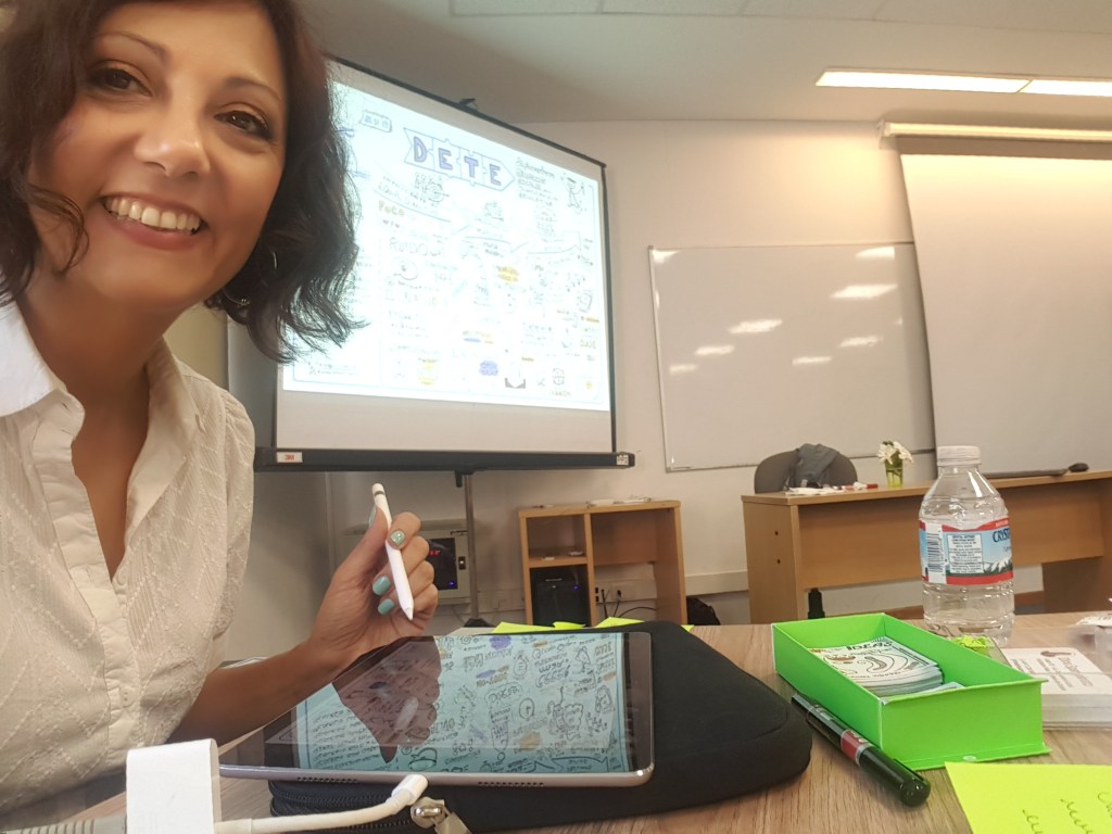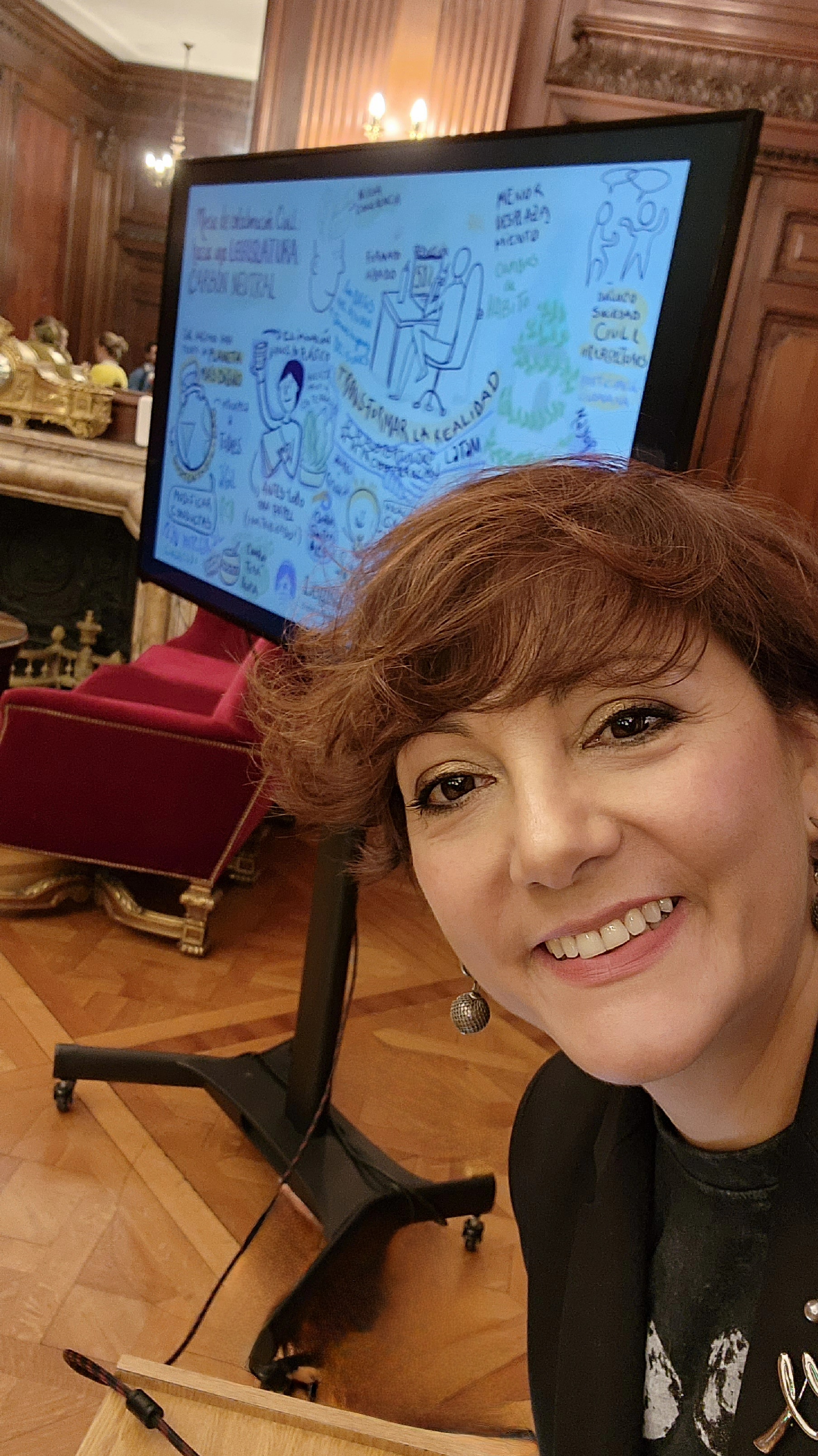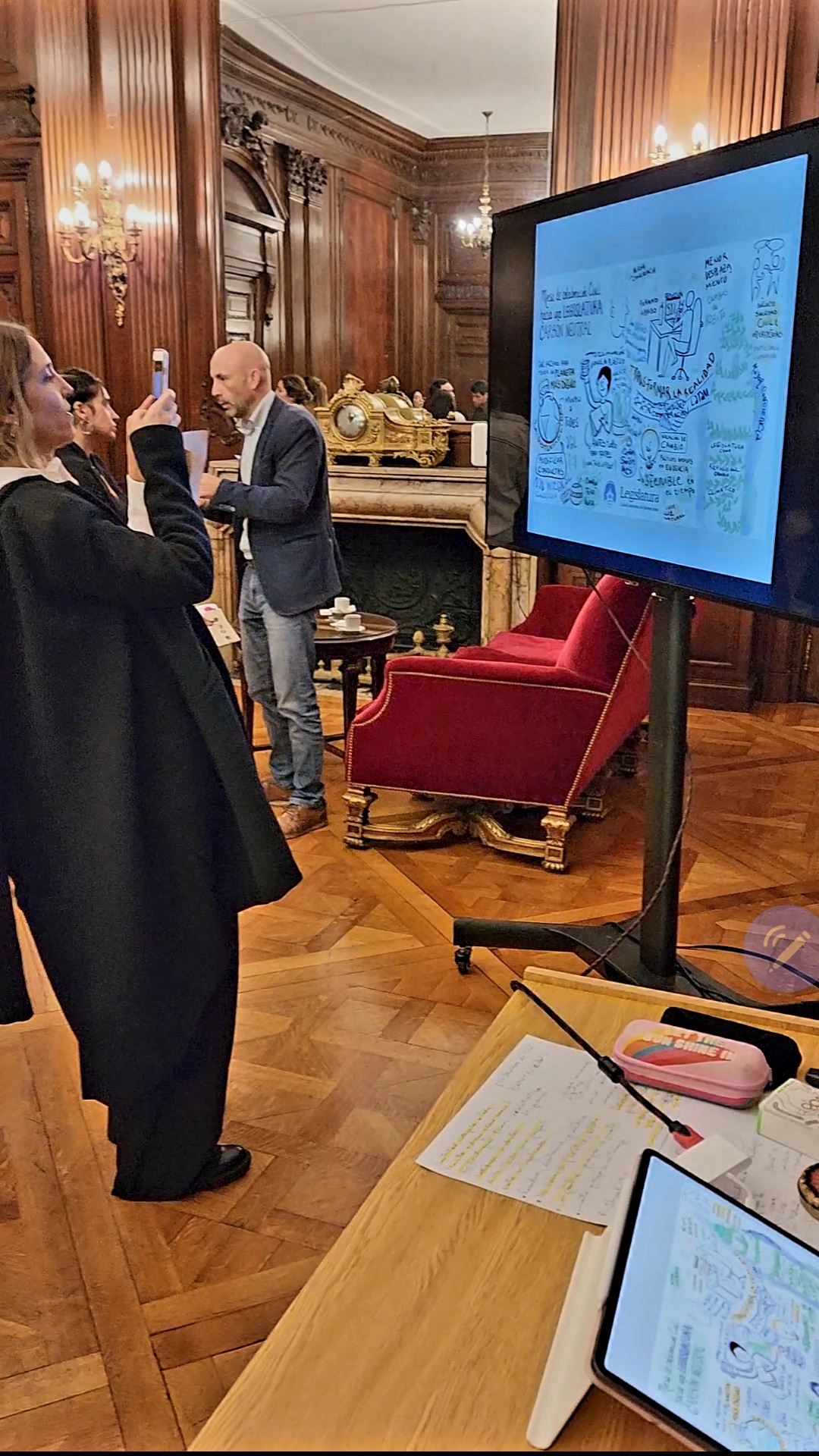 TIP. El servicio iba a ser inicialmente en papel y yo viajé a Mendoza con el portaplanos con el papel de plotter y todos los marcadores. Pero una hora antes, cambiamos a Digital, ya que el cliente pensó que sería mejor que se proyectara el Registro en vivo al lado de la Presentación que ellos traían. Por suerte también iba preparada con todo mi kit digital, ¡la versatilidad y adaptabilidad al entorno frente a todo!