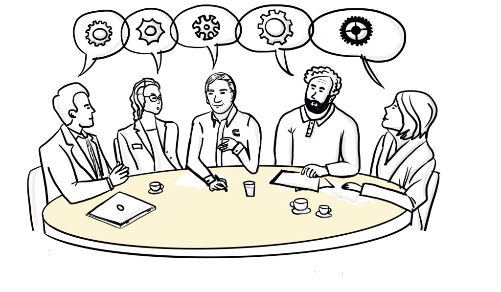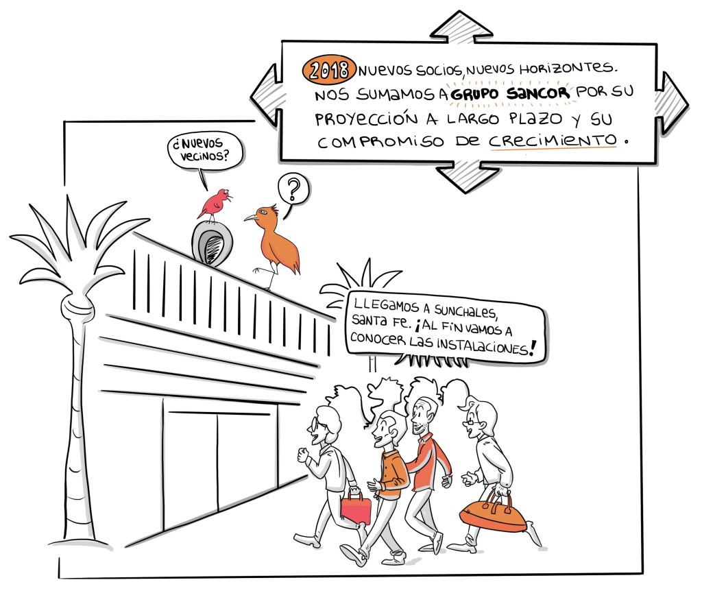 CUMMINS. Presentación: Ciclo de vida del producto. Presentación dibujada en formato Storytelling. A través de imágenes se contó el proceso de ventas de la empresa. Se hicieron los retratos de todos los vendedores latinoamericanos para ir adecuando la presentación a cada país.