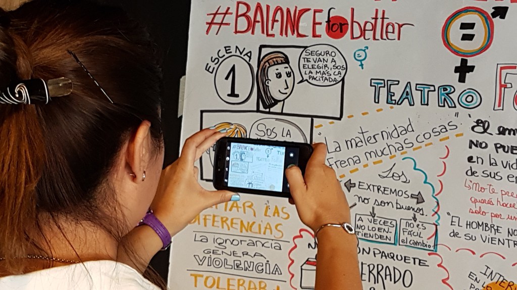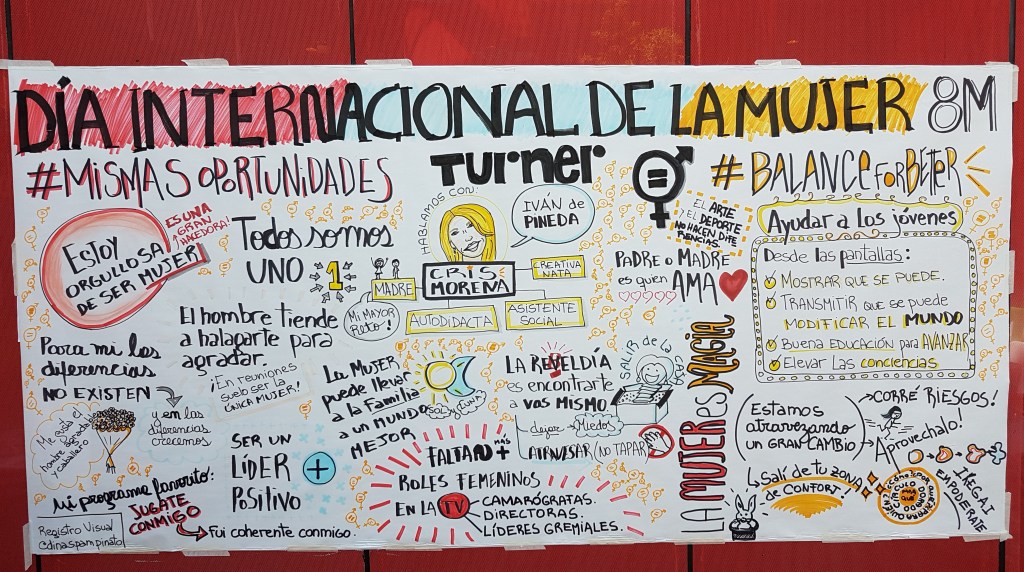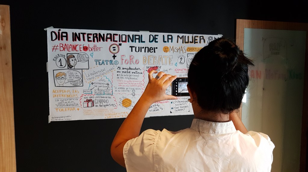 TURNER. Día internacional de la Mujer. Facilitación Gráfica en papel y luego se pasó a formato digital. Se recogieron todas opiniones del público interno de la empresa, en un Foro Debate que se organizó para visibilizar posibles situaciones de discriminación hacia la mujer en la oficina, representada por un grupo de actores.