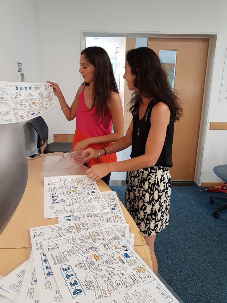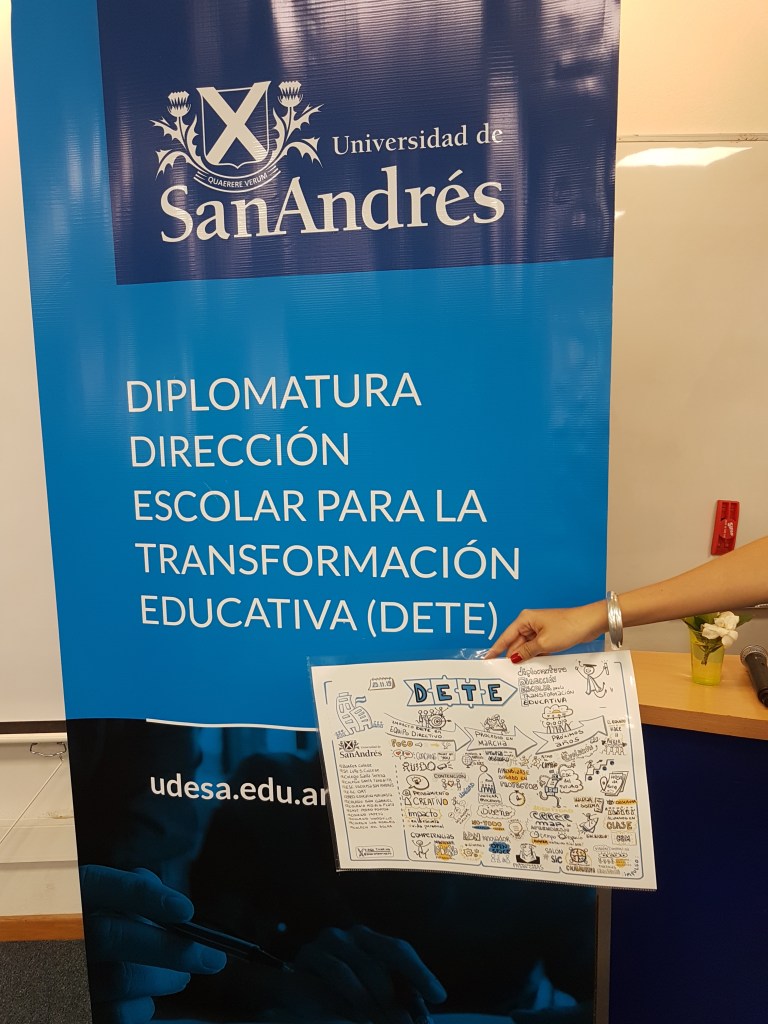 UDESA (Universidad de San Andrés). Diplomatura DETE. Registro Visual en vivo. Síntesis de la presentación de 14 escuelas que hablaban cada 10 minutos. Luego de finalizado el evento, se imprimió en A3 el lienzo de la documentación para entregarles uno a cada escuela participante, junto al certificado.