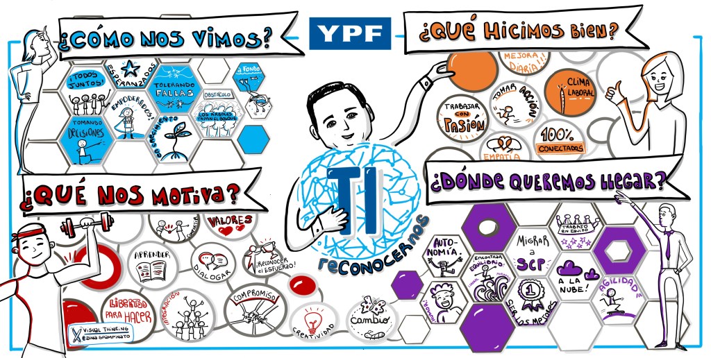 YPF. Reunión del área de Tecnología de la Información para hacer una revisión del 2019 y pensar los objetivos 2020. En la primera parte del encuentro, mientras la gente desayunaba, iba completando tarjetas con preguntas que luego se volcaron al lienzo que el CIO rescató al final de la reunión.
