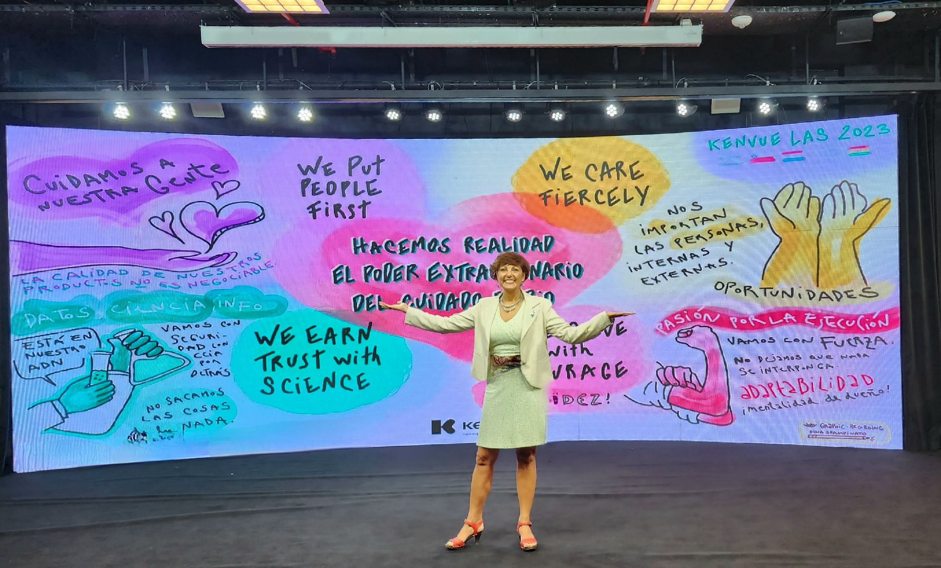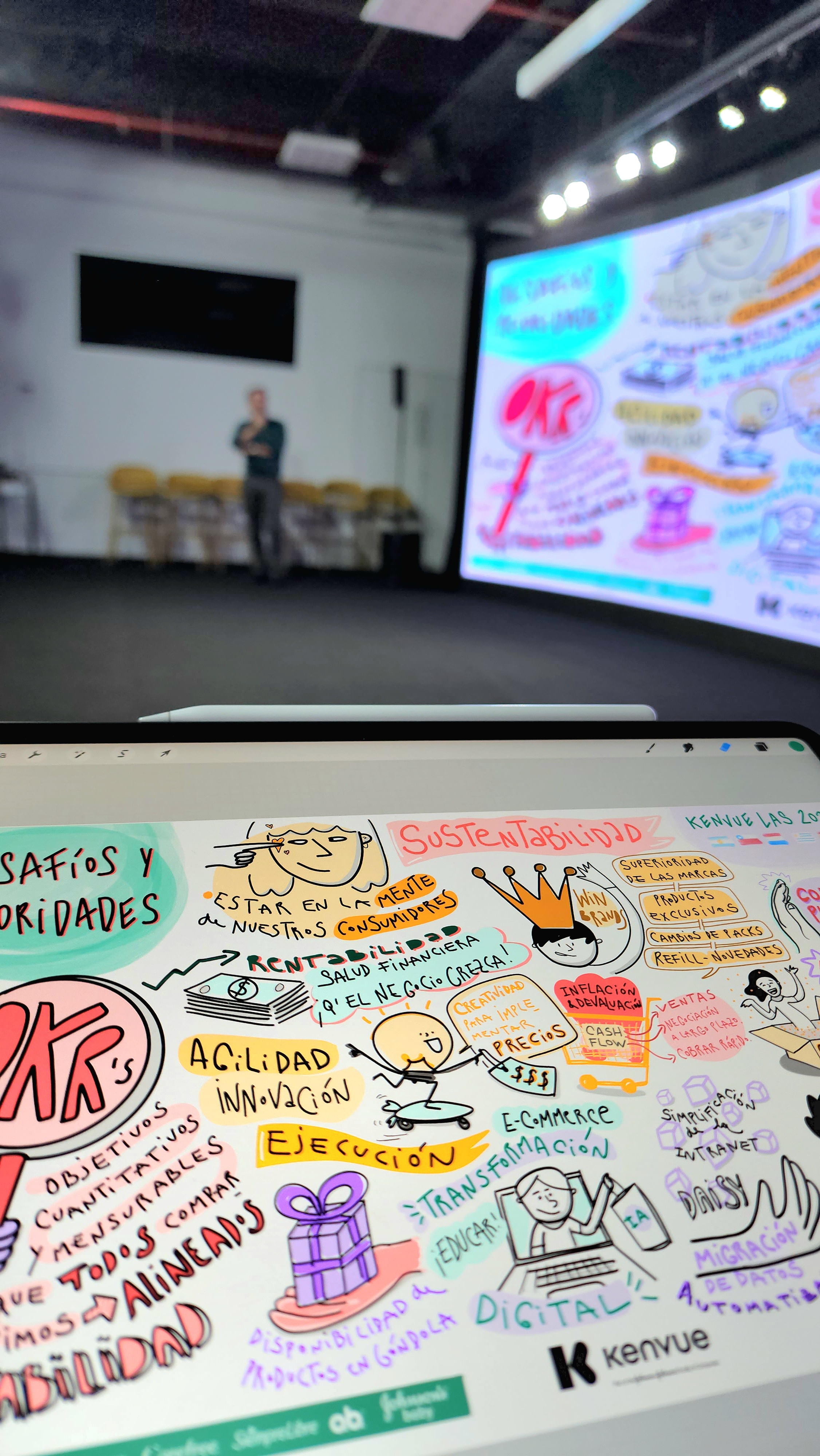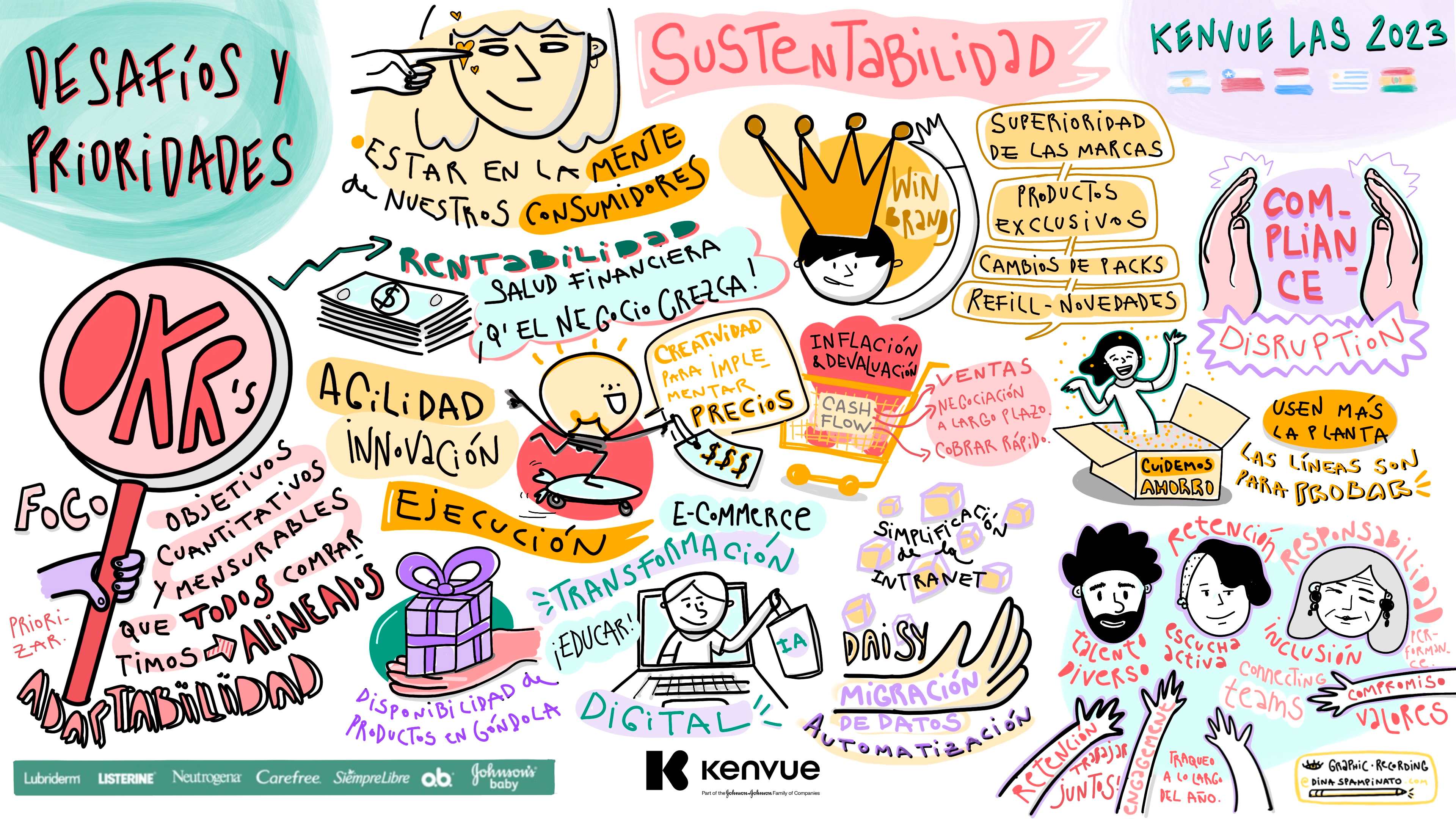 KENVUE. Presentación fusión con Jhonson & Jhonson. Registro Visual en vivo de Desafíos y Prioridades, para este lienzo, hablaron cada una de las áreas de la emprensa que presentaron informes y OKRs. Por otro lado, se visibilizaron los valores de la entrante Kenvue.
