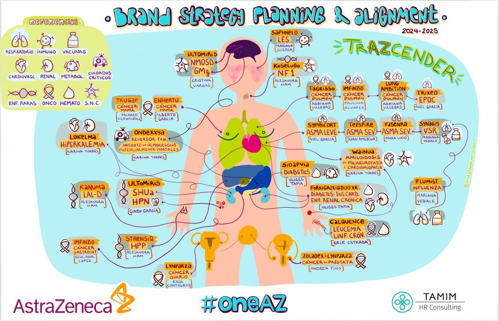 ASTRAZENECA MÉXICO. Alineación y Planificación de la estrategia de marca 2024-2025. Infográfico interno para representar a los ejecutivos por etiqueta (nombre comercial del medicamento), enfermedad y zona del cuerpo afectada. La idea fue lograr mayor conocimiento entre los empleados y que tengan más sinergia entre ellos a la hora de consultar o resolver problemas comunes interáreas. Más info: infográficos dibujados.