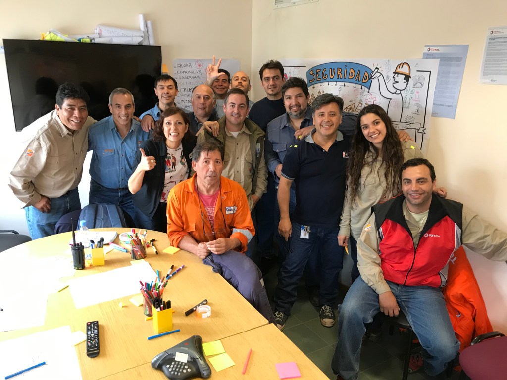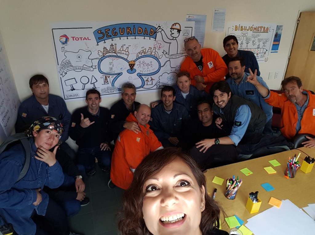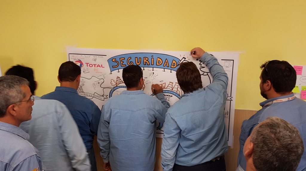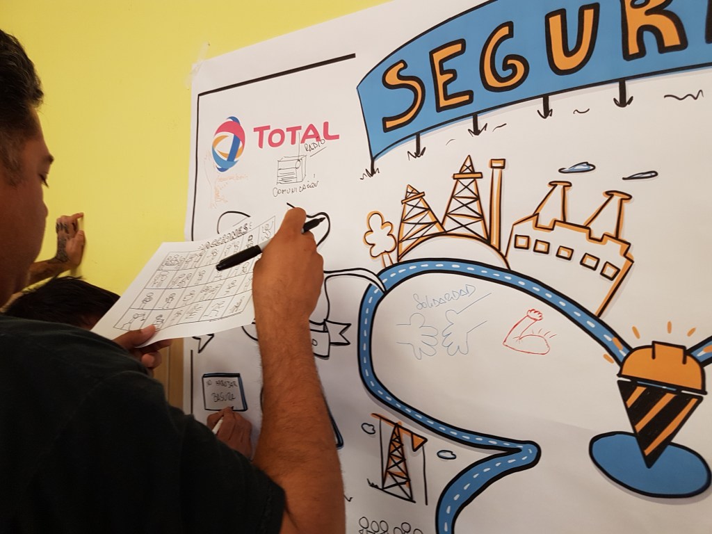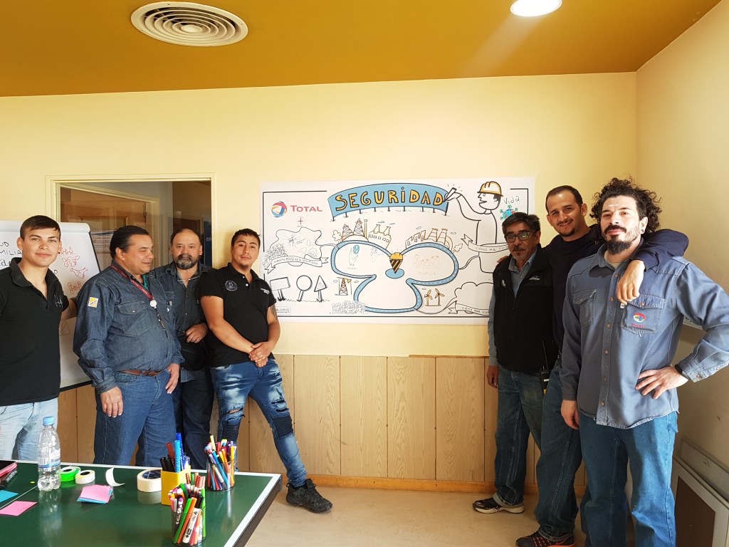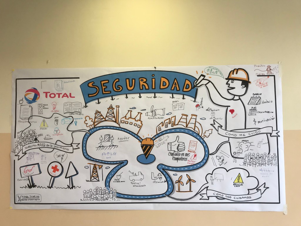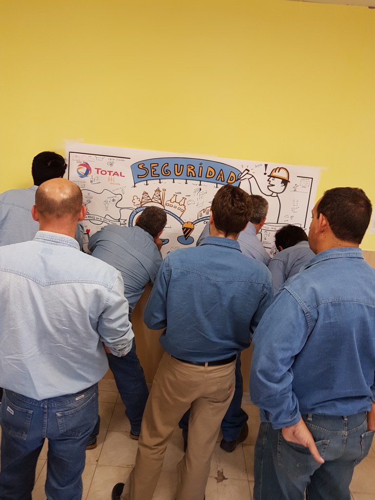 En el marco de la Semana de la Seguridad, se invitó a los colaboradores de Total ha hacer una intervención creativa con ideas de la Cultura en seguridad. Se los instó a expresarse libremente, dejar de lado lo escrito y pensar en qué cosas ellos hacen para cuidarse individualmente y en equipo. Todas las ideas que salieron individualmente, luego fueron chequeadas entre todos de manera colaborativa hasta llevarlas a un lienzo con dibujos y palabras claves.