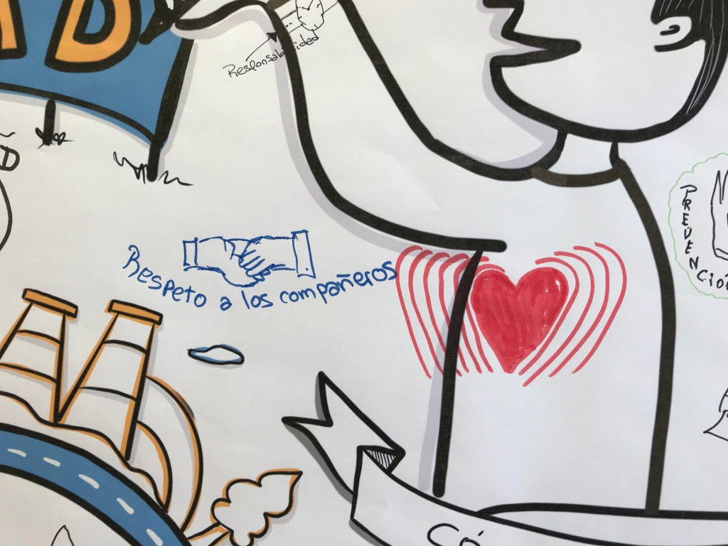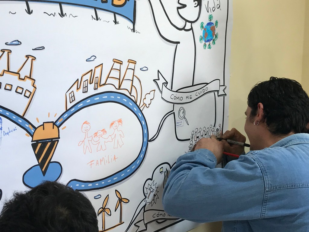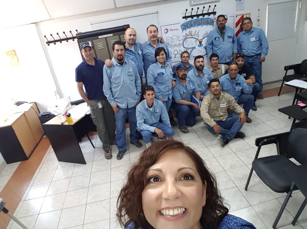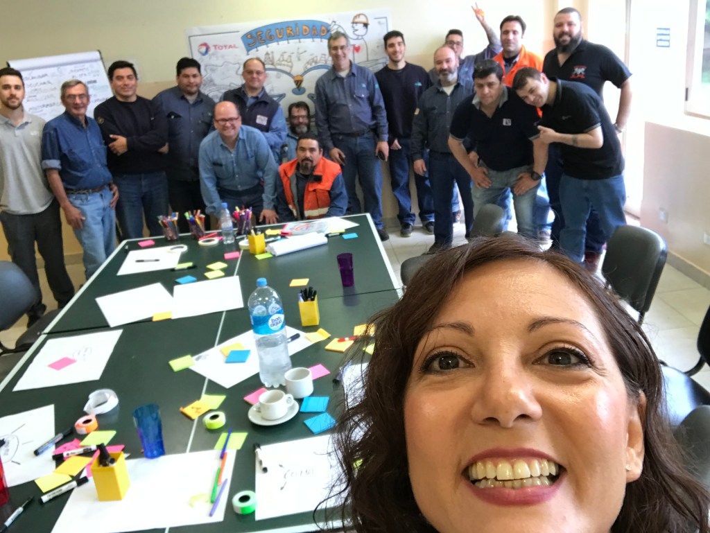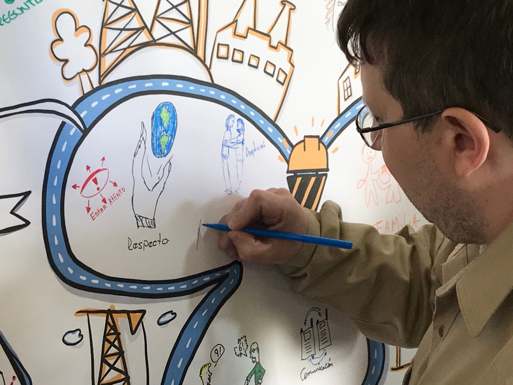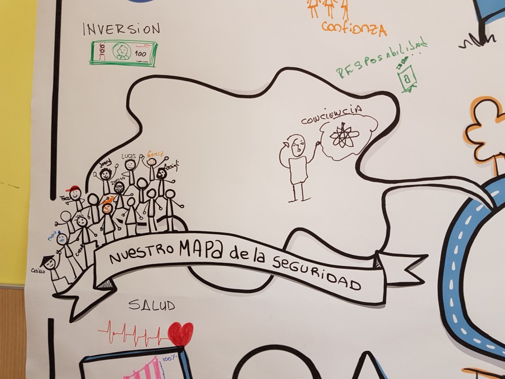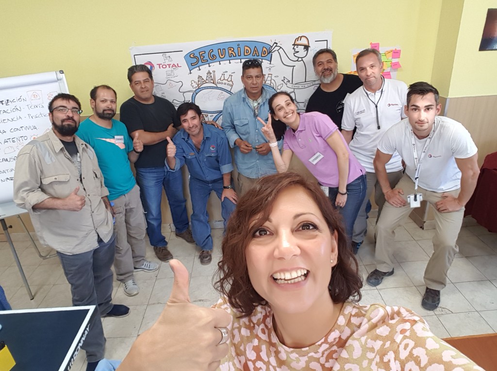 En el marco de la Semana de la Seguridad, se invitó a los colaboradores de Total ha hacer una intervención creativa con ideas de la Cultura en seguridad. Se los instó a expresarse libremente, dejar de lado lo escrito y pensar en qué cosas ellos hacen para cuidarse individualmente y en equipo. Todas las ideas que salieron individualmente, luego fueron chequeadas entre todos de manera colaborativa hasta llevarlas a un lienzo con dibujos y palabras claves.